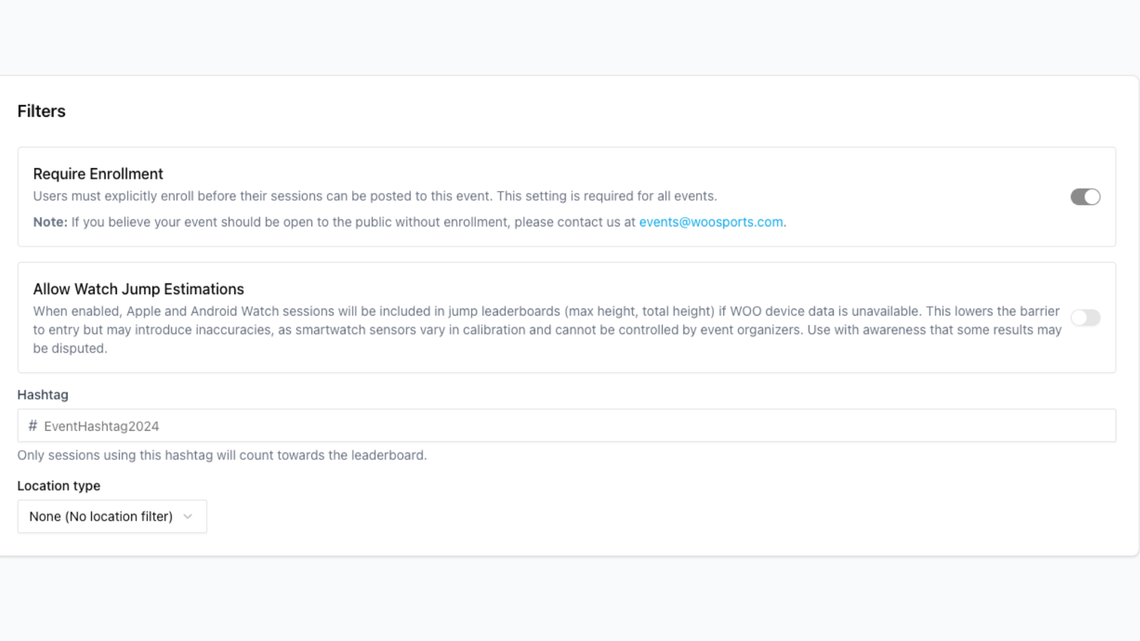 - Add filters: Require enrolment; Allow watch estimations;Hashtags; Location type
