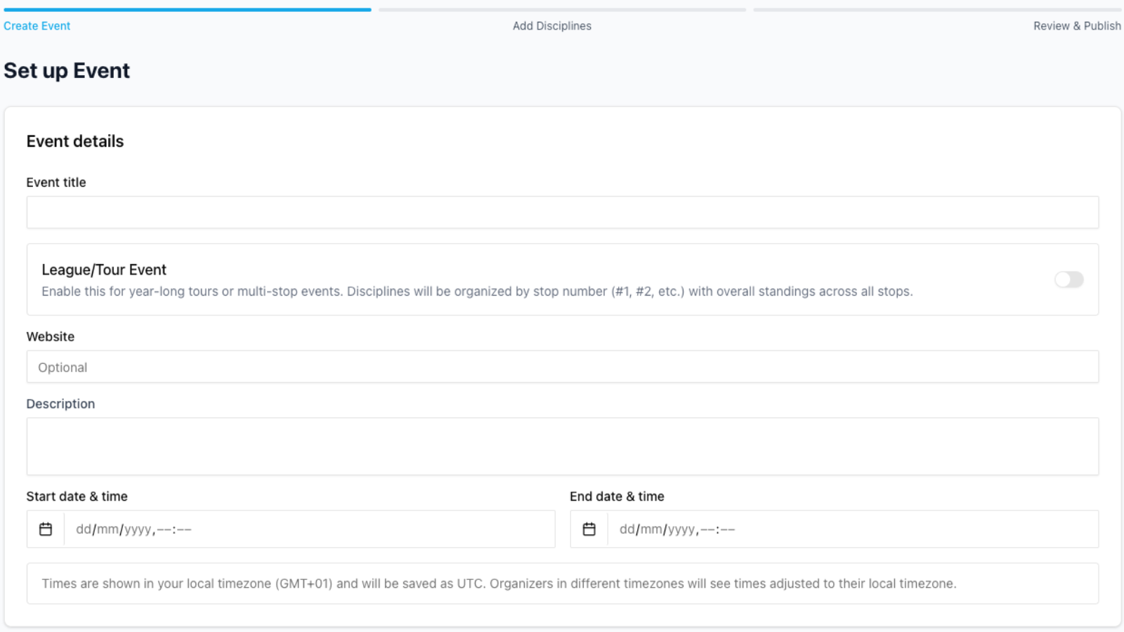This brings you to the first of 3 sections "Create Event" where you set up the name, number of stops and over all dates for all the disciplines to run.