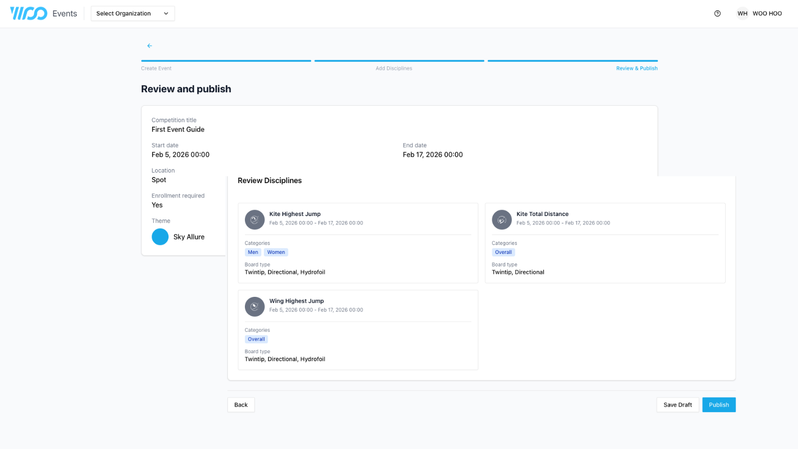 Double check the dates and details you have chosen both for the overall event and the individual disciplines you have added.