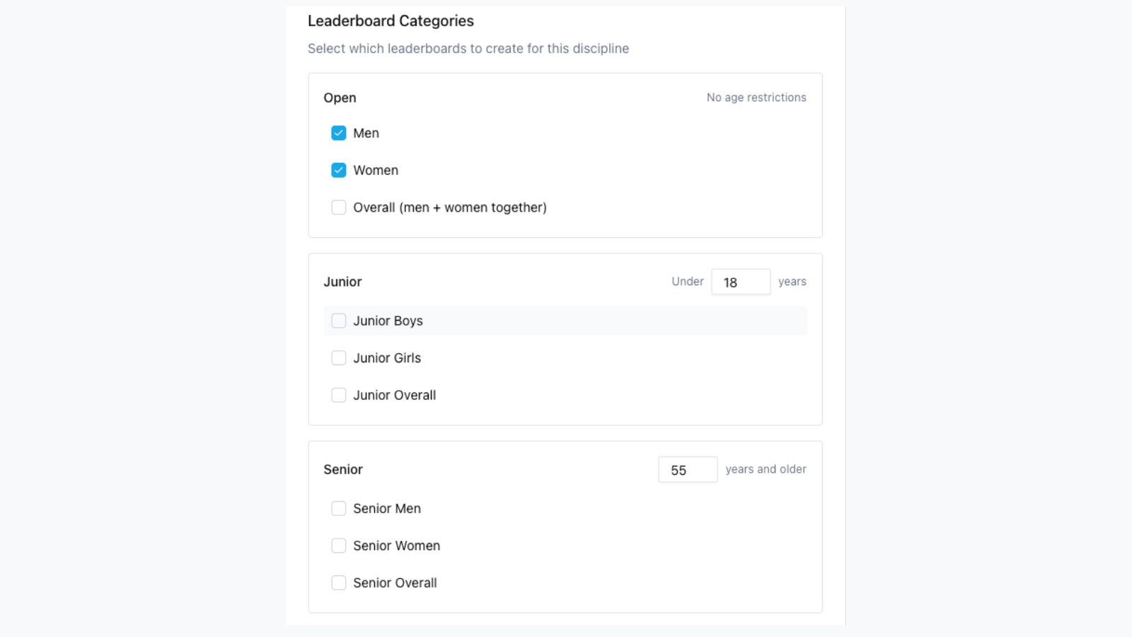 Default dates are set to your overall event dates, but can be adjusted to your preferences. - Select your leaderboard categories: Split by gender and age or all inclusive with "over all" and no junior/senior categories selected - Each category will have its own tab on the leaderboards.